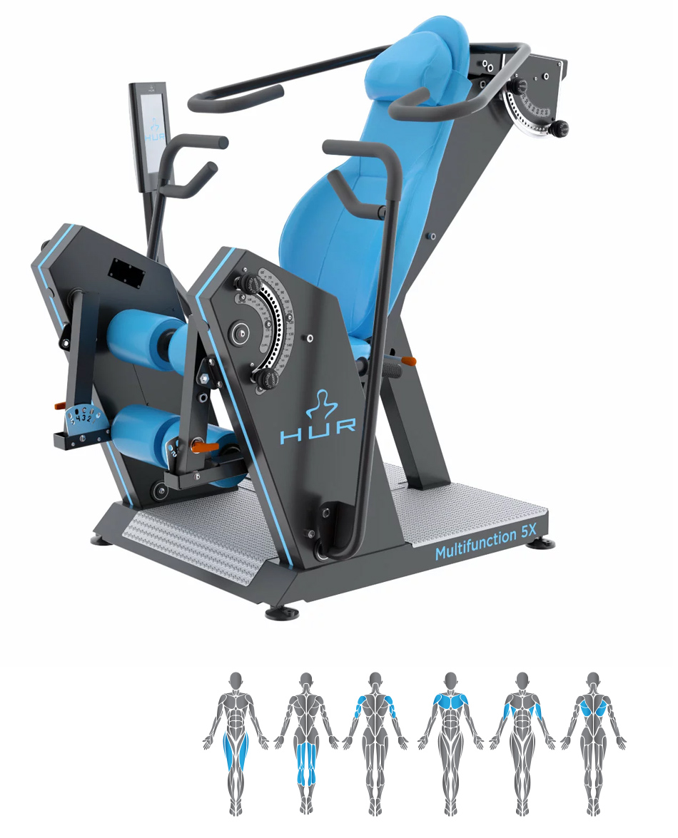 HUR Multifunction 设备是一机多用的多功能力量训练设备。设备的主要特点是仅占用约1台设备的空间但可以提供4、5种针对不同肌群的训练内容。在不同训练内容之间切换通过触控屏操作,十分便捷。