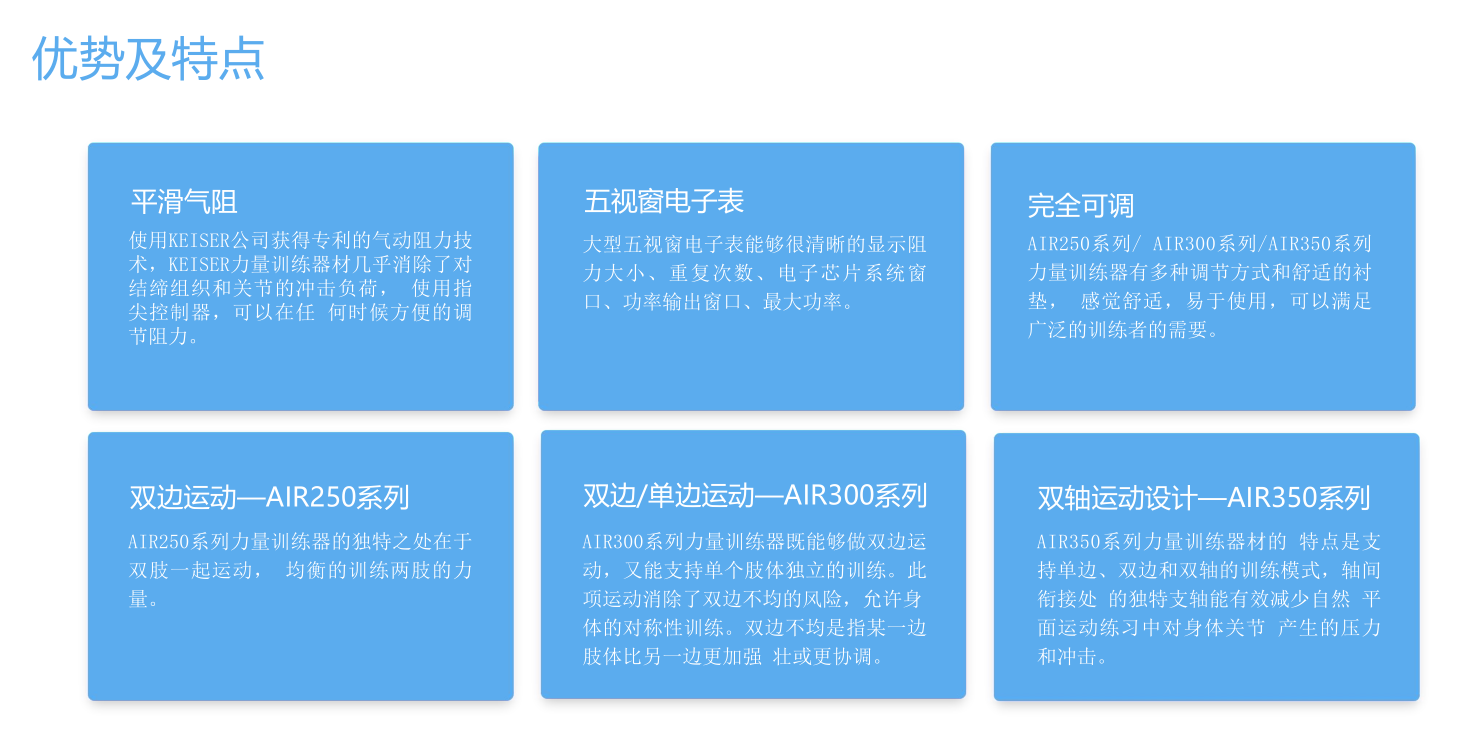 2.阻力系统:提供连续、恒定、可细微调整的气动阻力模式;尽量消除了对身体结缔组织和关节的冲击;