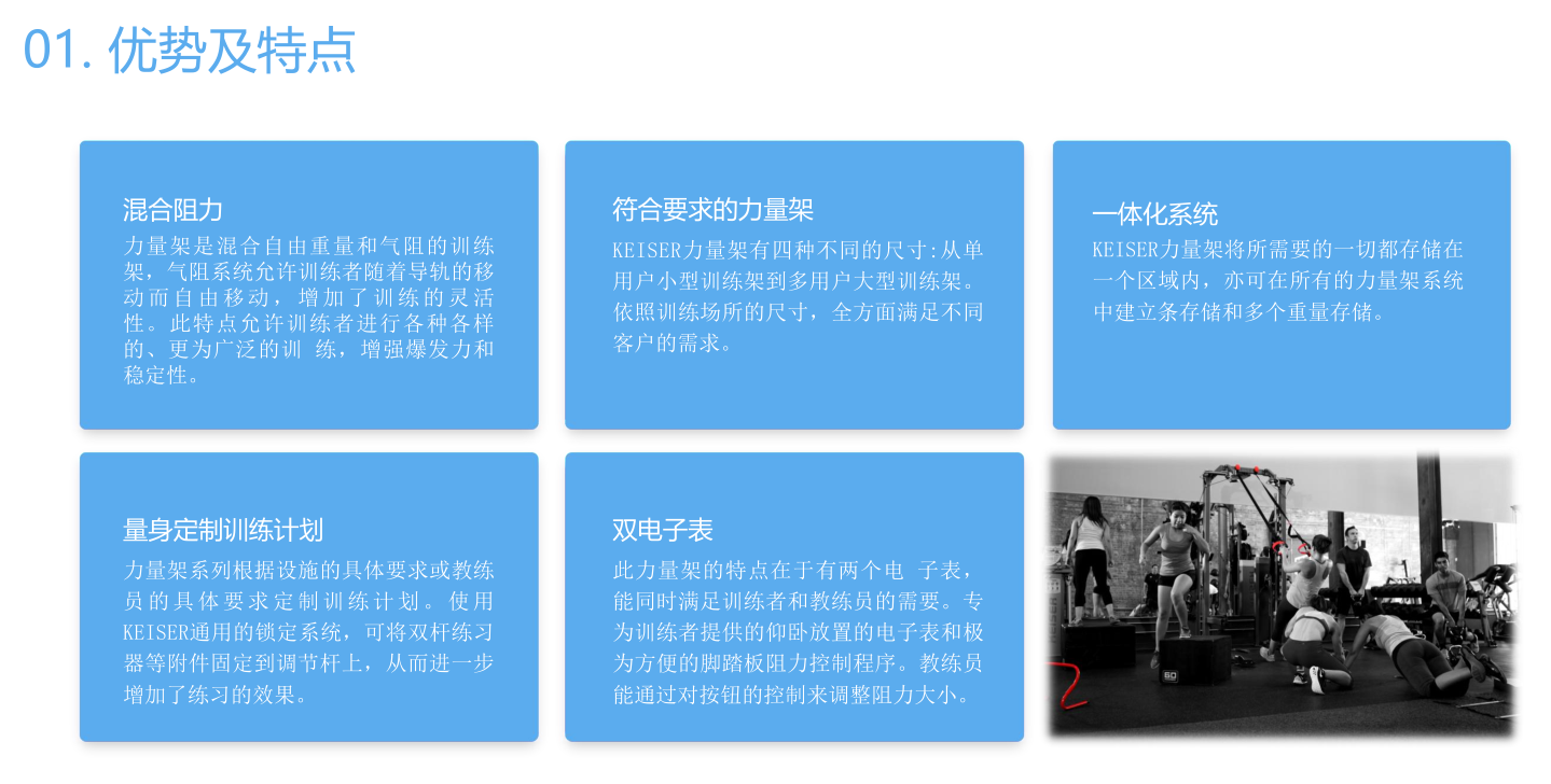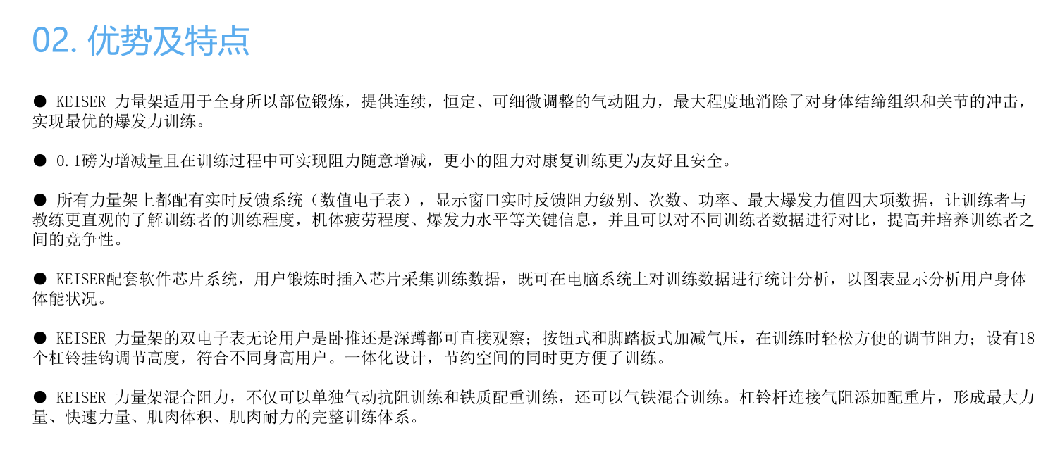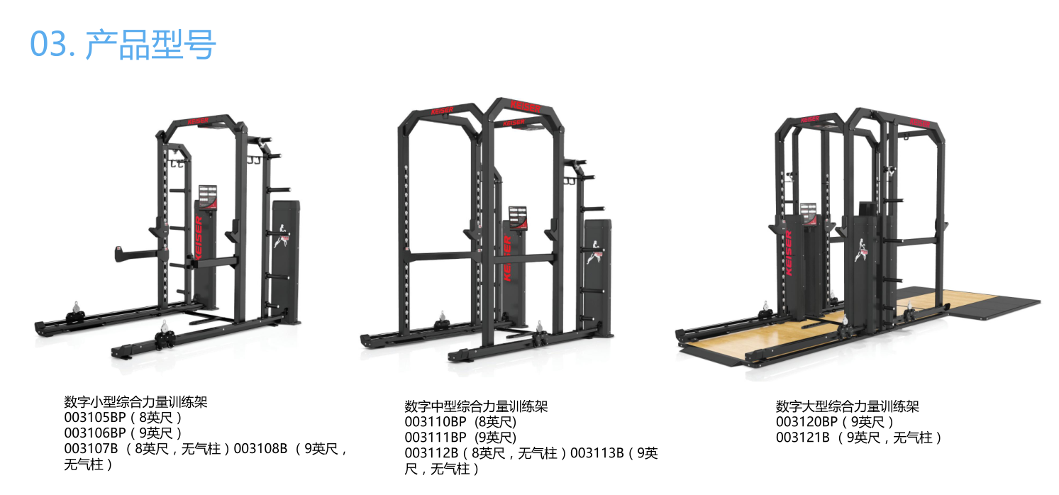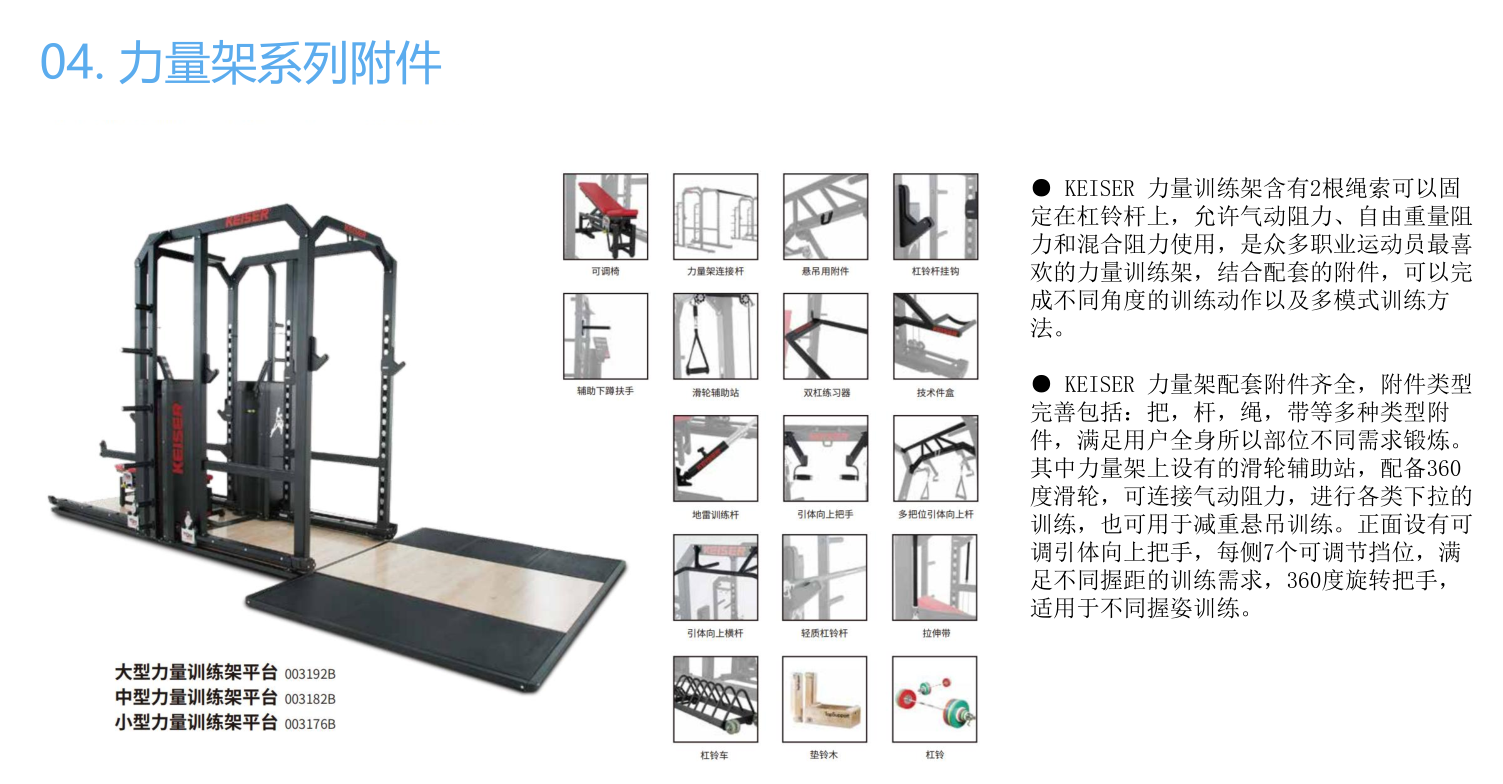 KEISER 力量架适用于全身所以部位锻炼,提供连续,恒定、可细微调整的气动阻力,最大程度地消除了对身体结缔组织和关节的冲击,实现最优的爆发力训练。