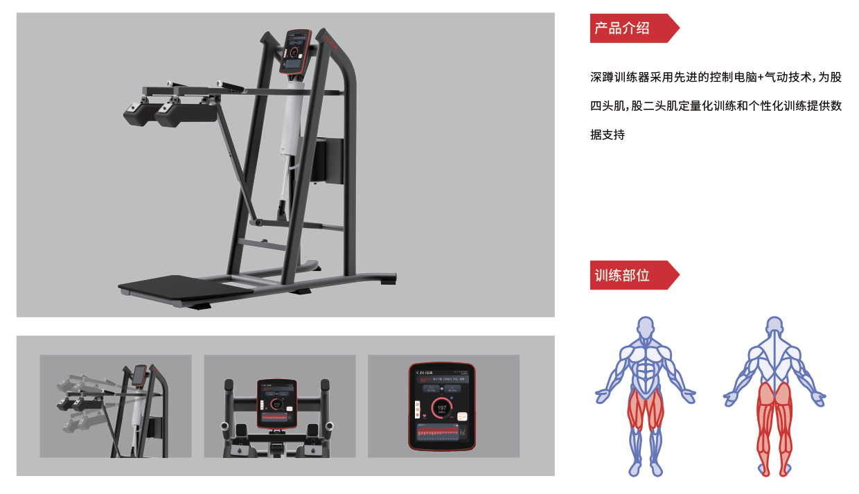 深蹲训练器采用先进的控制电脑+气动技术,为股四头肌,股二头肌定量化训练和个性化训练提供数据支持。