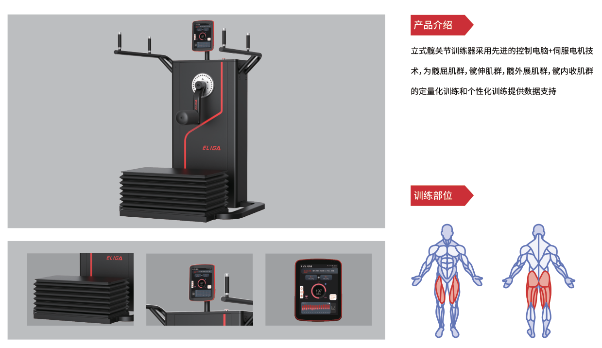 立式髋关节训练器采用先进的控制电脑+伺服电机技术,为髋屈肌群,髋伸肌群,髋外展肌群,髋内收肌群的定量化训练和个性化训练提供数据支持。
