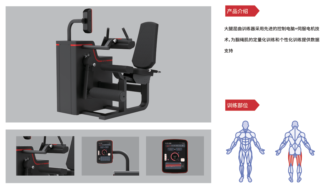 大腿屈曲训练器采用先进的控制电脑+伺服电机技术,为腘绳肌的定量化训练和个性化训练提供数据支持。