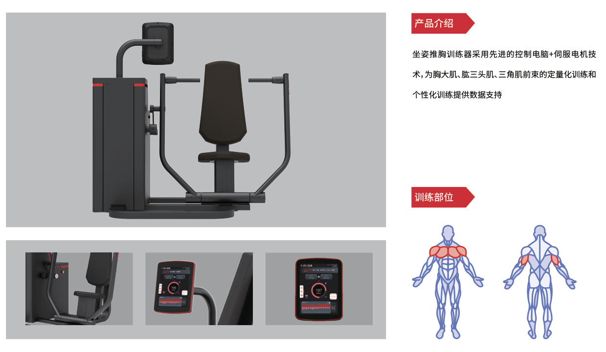 坐姿推胸训练器采用先进的控制电脑+伺服电机技术,为胸大肌、肱三头肌、三角肌前束的定量化训练和个性化训练提供数据支持。
