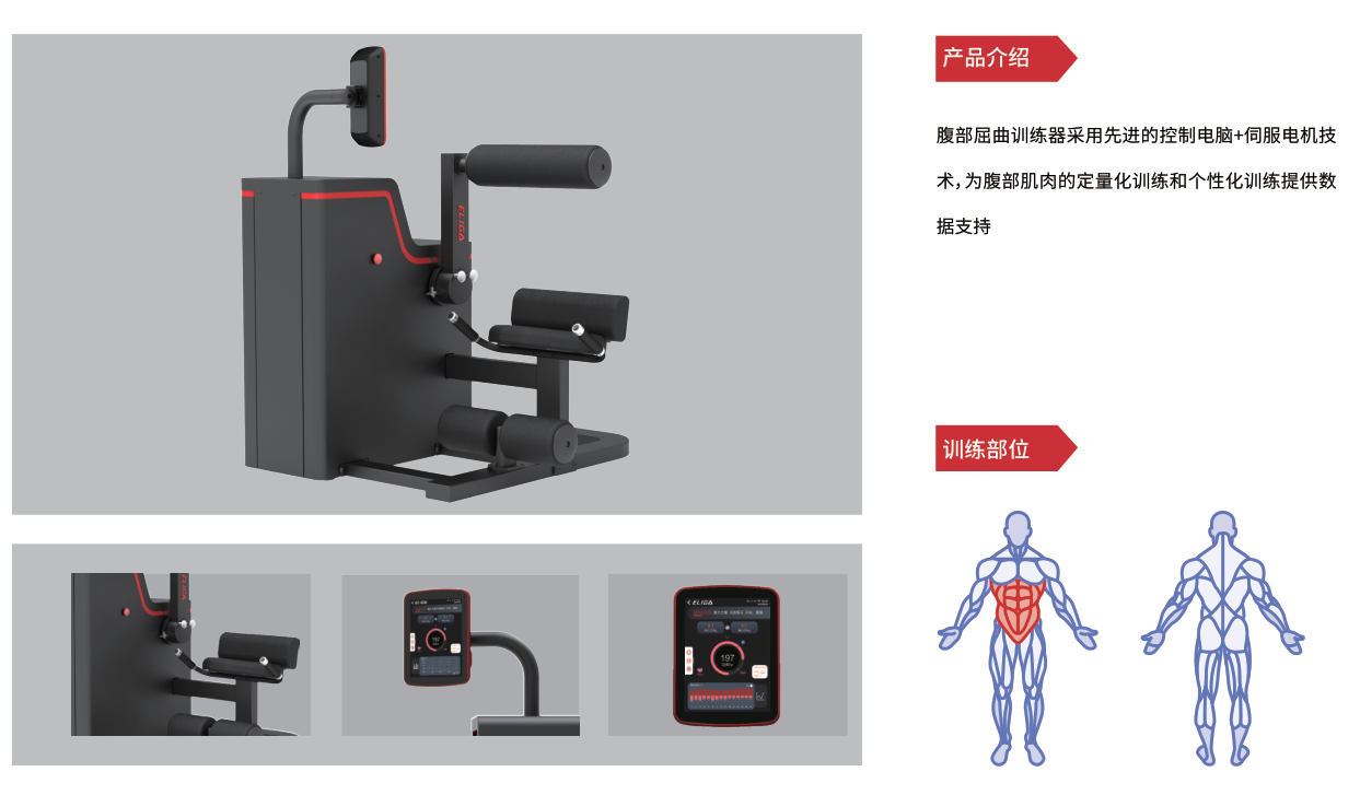 腹部屈曲训练器采用先进的控制电脑+伺服电机技术,为腹部肌肉的定量化训练和个性化训练提供数据支持。