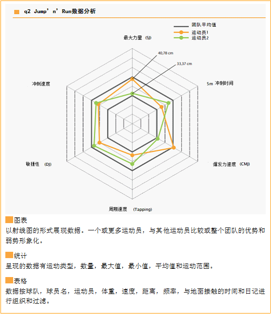 q2 Jump’n’Run的数据管理功能使教练和运动员能开发一个长期监测计划,而不是零星的测试,这在适当的开发训练策略上有大大的帮助。